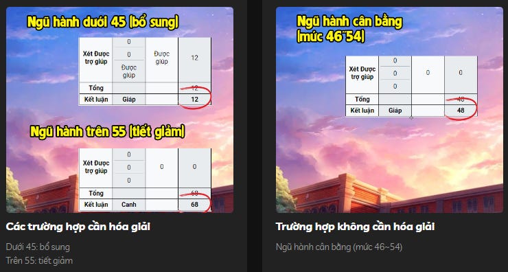 Nếu ngũ hành thiếu dưới 45%, cần bổ sung. Còn nếu ngũ hành thiếu trên 55%, cần tiết bớt. Và hiển nhiên, cách tính dân gian đếm ngũ hành trong Bát tự thuần túy (xem số lượng, không xem vượng suy + tương tác) cũng là cách xem sai lầm, thiếu chính xác.